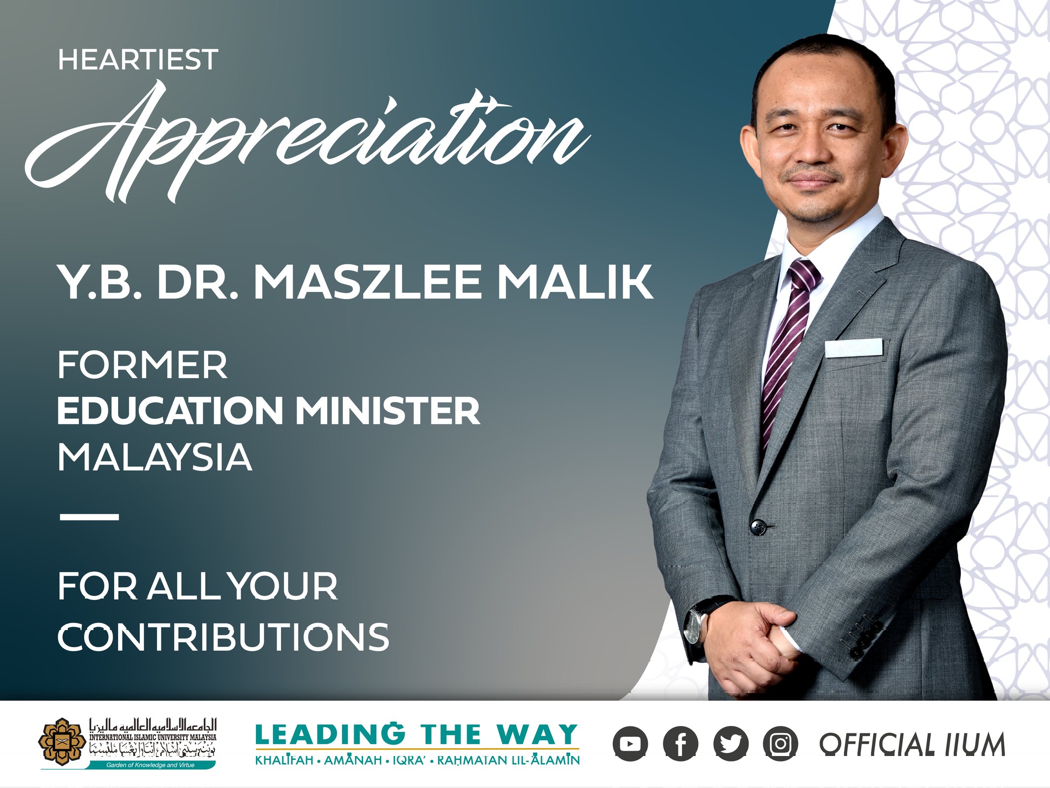 Education Dr Maszlee Malik Maszlee giving up IIUM presidency. Education Minister Dr Maszlee Malik has confirmed he has resigned as International Islamic University Malaysia IIUM president. WELCOME TO CFS CAMPUS YB DR MASZLEE MALIK.